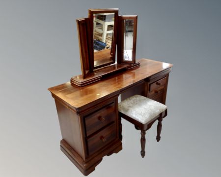 A Willis and Gambier seven drawer twin pedestal dressing table with matching triple mirror and stool