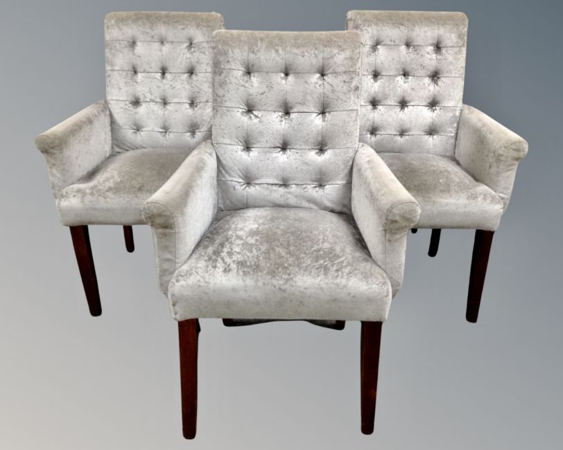 A set of three contemporary high backed armchairs upholstered in silvered fabric
