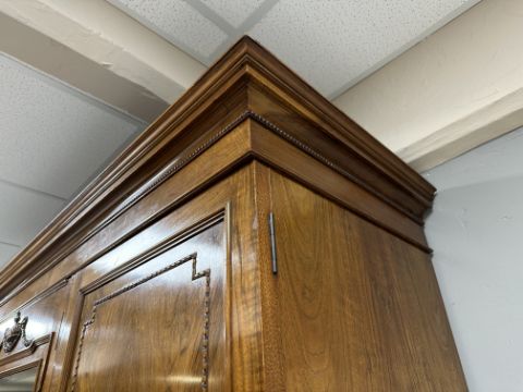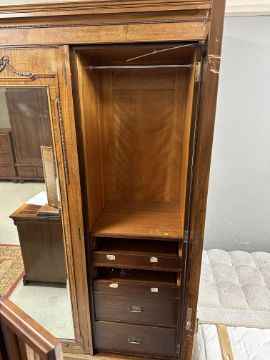 A late Victorian walnut triple door wardrobe with central mirrored panel door, fitted with drawers and rails, width 194cm