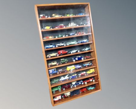 A display case containing 43 Matchbox, Days Gone & Lledo die cast cars and delivery vans