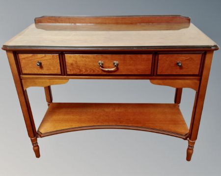 A six drawer chest together with similar glass topped three drawer hall table and headboard in teak finish