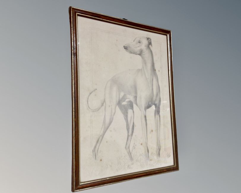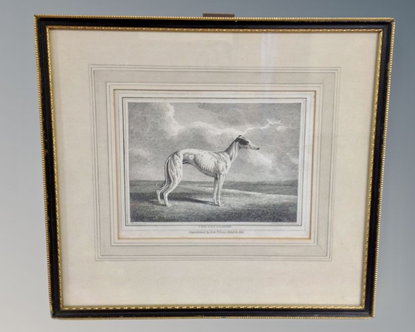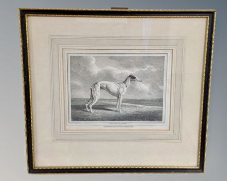 After P Horton : Greyhound study, monochrome print, 30cm by 40cm, together with a similar engraving. (2)
