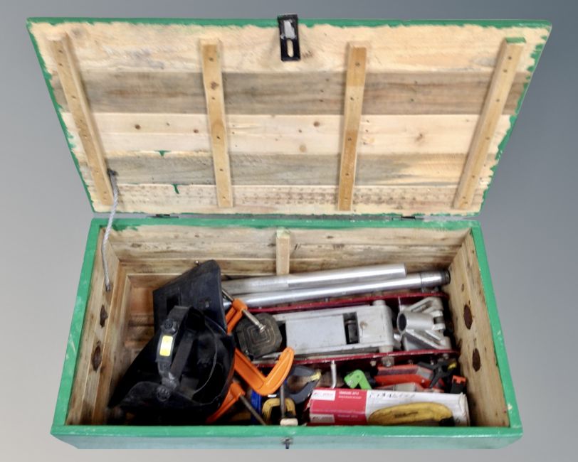 Two painted pine tool boxes containing G-clamps, welding masks, trolley jack etc