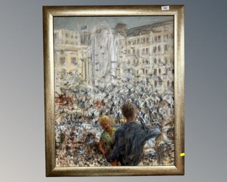 Contemporary School : Two Figures in a City Square with Pigeons, textured print on canvas, with unidentified monogram, 75 cm x 60 cm, framed.