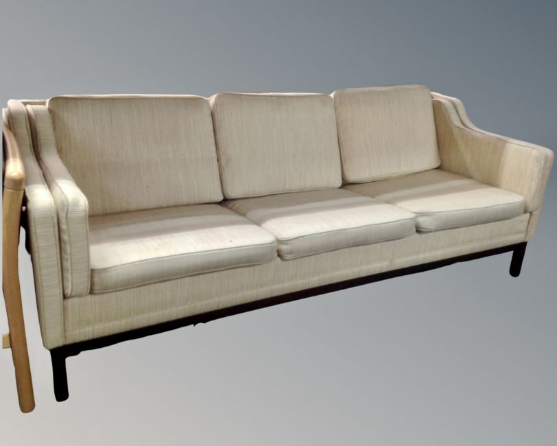A 20th century Scandinavian three seater settee with beige fabric cushions.