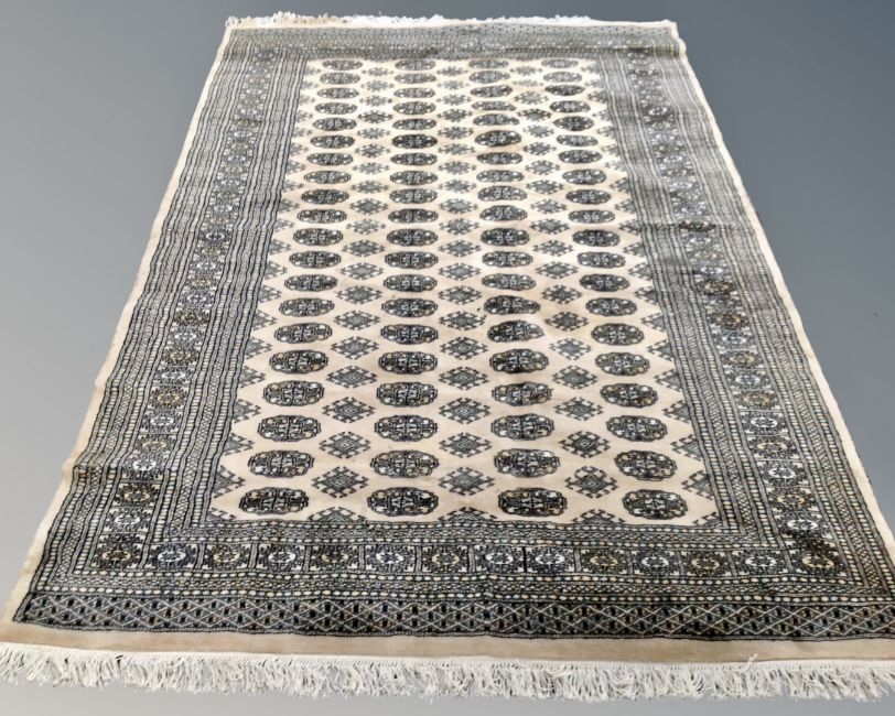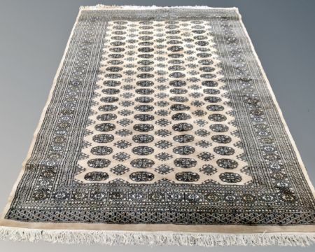 A Lahore Bokhara rug, Pakistan, on cream ground, 246cm by 153cm.