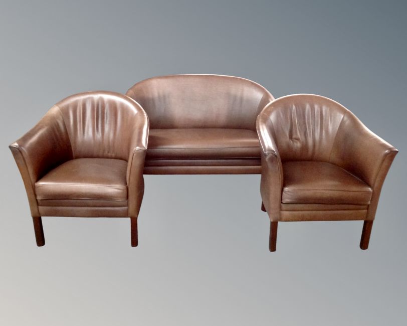 A three piece reception suite comprising of a settee and two tub chairs, upholstered in brown leather.