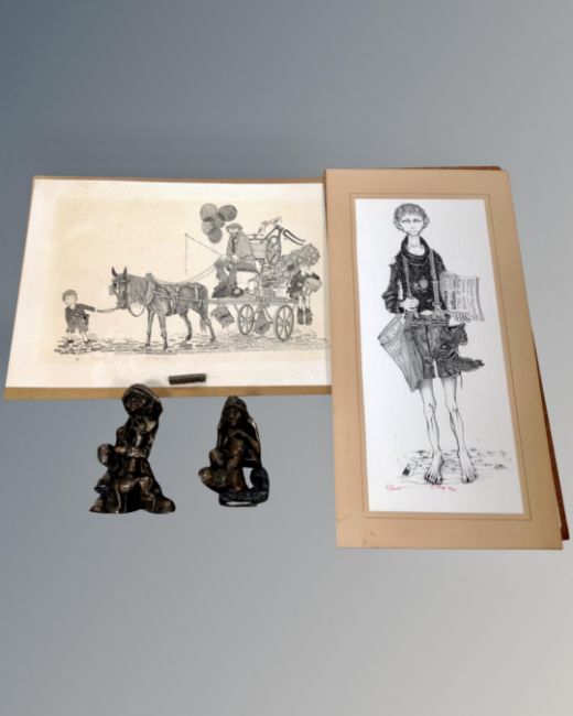 Two unframed signed limited edition Robert Olley prints together with two Robert Olley resin figures.