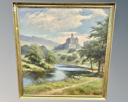 20th century school : Castle within a valley, oil on board, indistinctly signed, 94cm by 91cm.