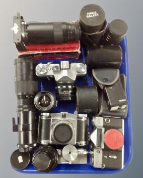 A tray containing a collection of vintage cameras including Zenit EM, Zenit-B, Paxina 29, together with camera lenses including Paragon 300mm, Hanimar 28mm, Prinzgalaxy 35mm etc.