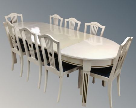 A 20th century painted oak oval extending dining table with three leaves (length 234cm), together with a set of eight dining chairs.