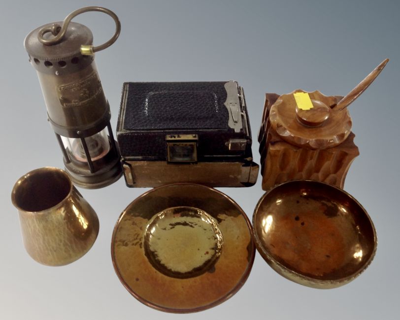 A box containing metalwares, miniature brass miner's lamp, vintage camera, treen pot etc.