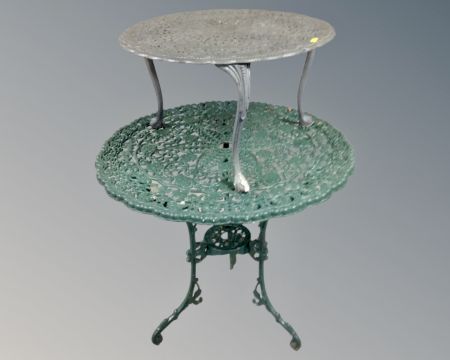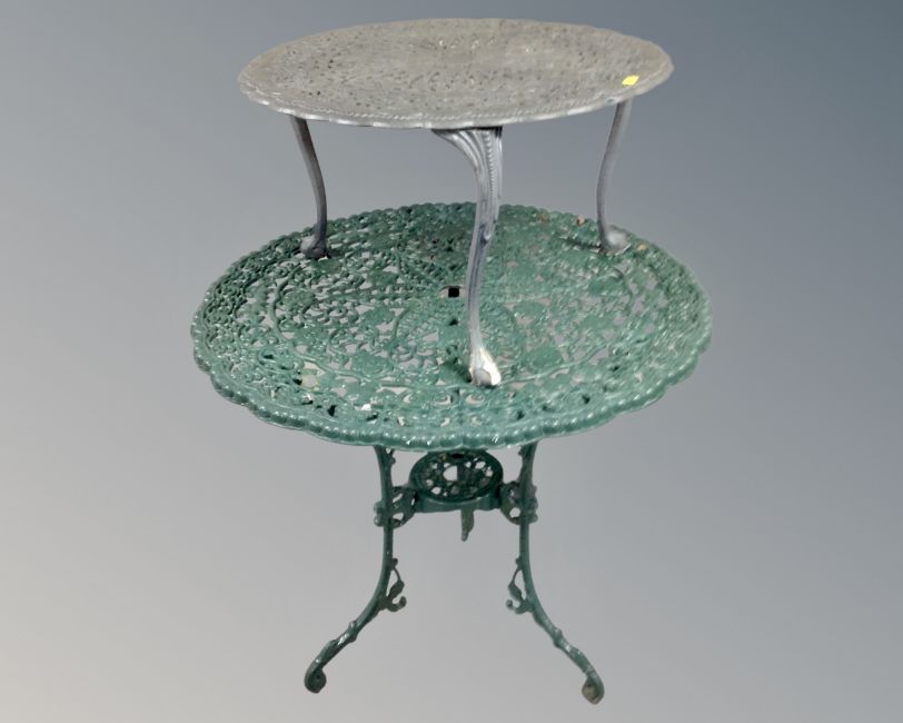 A cast metal decorative patio table and similar occasional table