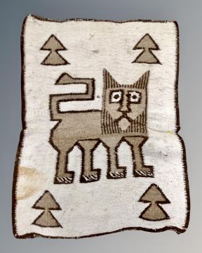 An eastern pictorial woollen rug depicting a stylised lion, 98cm by 75cm.