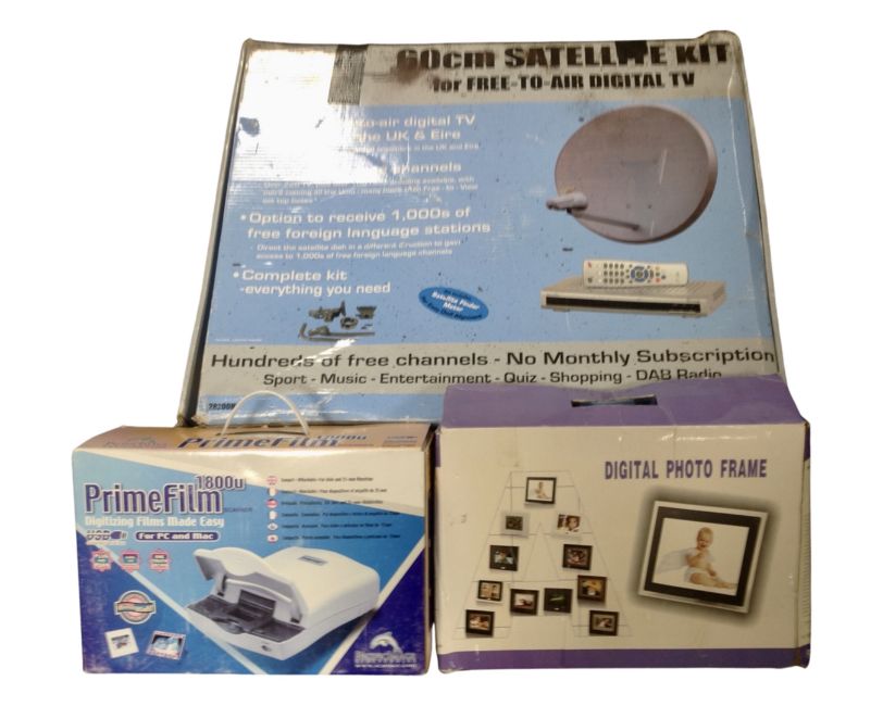 A Skyline 60cm satellite kit together with a digital photo frame and a Primefilm 1800u film digitizer (all parts boxed).