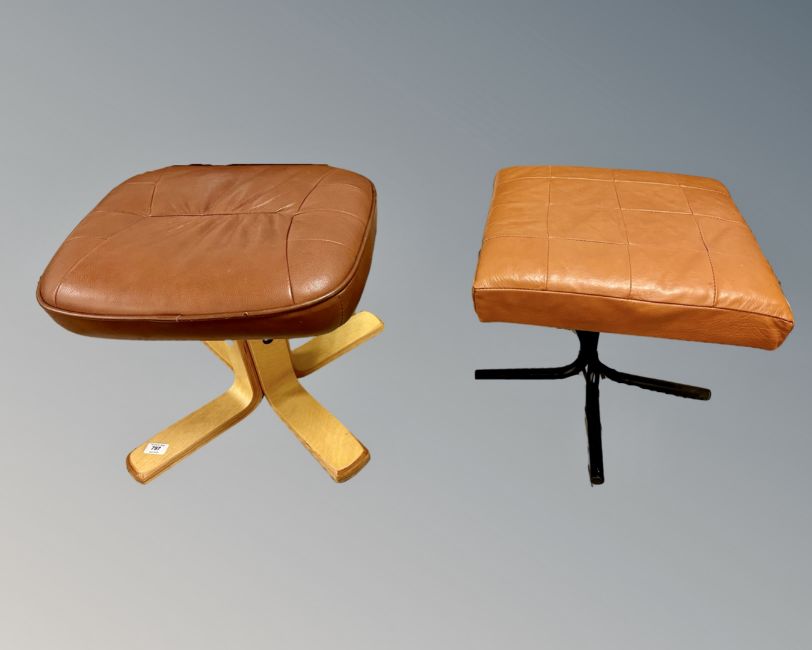 A 20th century tan leather upholstered footstool on metal legs together with a further footstool on beech legs.