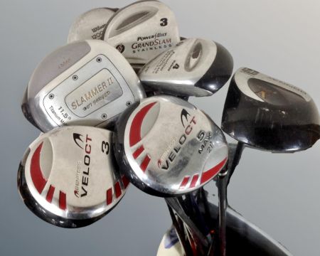 A tub containing a quantity of golf clubs, mainly drivers, including Donnay, Evolution, Wilson etc together with a boxed putting machine.
