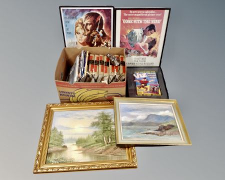 A box containing The Beatles magazines, encyclopedias, a model of a fishing trawler, oil paintings, framed Dr. Zhivago and Gone with the Wind film posters.