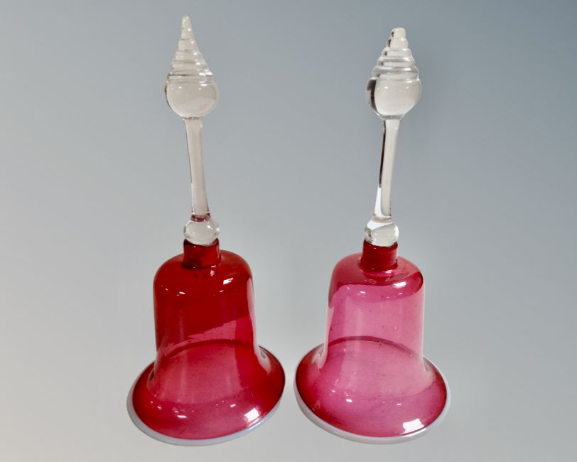 A pair of two tone glass hand bells. (height 32cm)