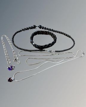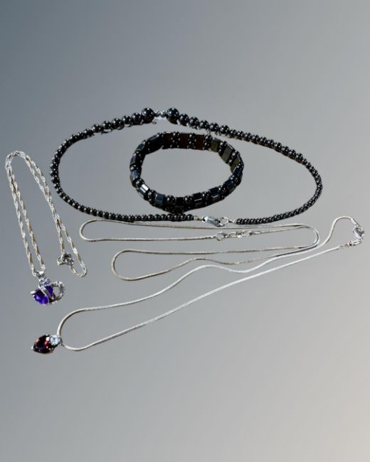 Three silver chains and pendants and a Hematite necklace and bracelet