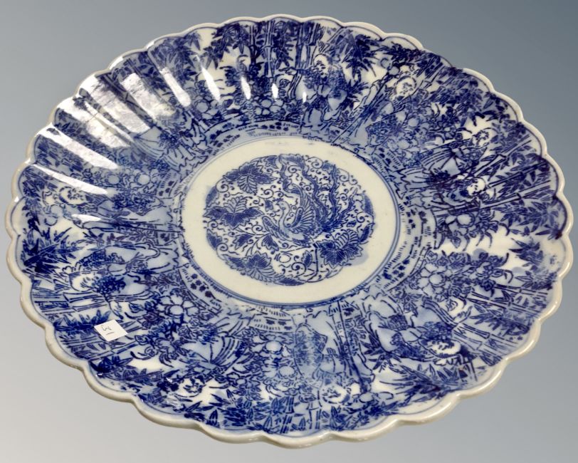 A Chinese blue and white scalloped edge imari plate. (width 31cm)