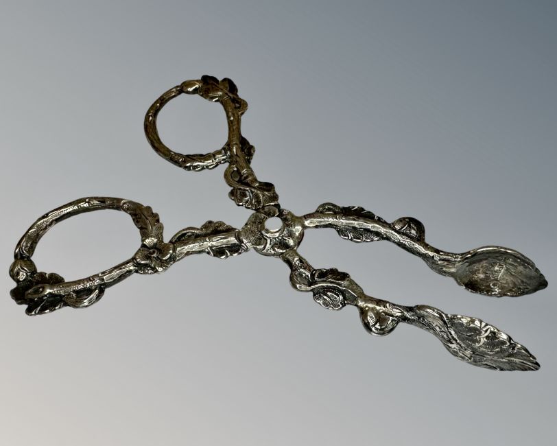 A highly ornate pair of Victorian silver sugar nips, by Hilliard and Thompson 1878.