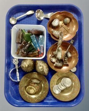 A tray containing a pair of copper scallop edge dishes, a pair of miniature eastern brass plates, vintage brooch (AF), coins, miniature bottles, letter opener, thimbles, military button etc.