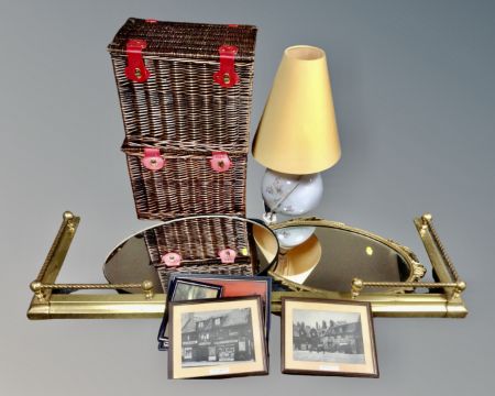 A brass extending fire curb together with two wicker baskets containing assorted pictures and mirrors and a pottery table lamp with shade.