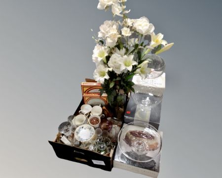 A box containing assorted glassware, artificial flowers, tea china, hip flask and three Dartington crystal bowls and cake stands (boxed).