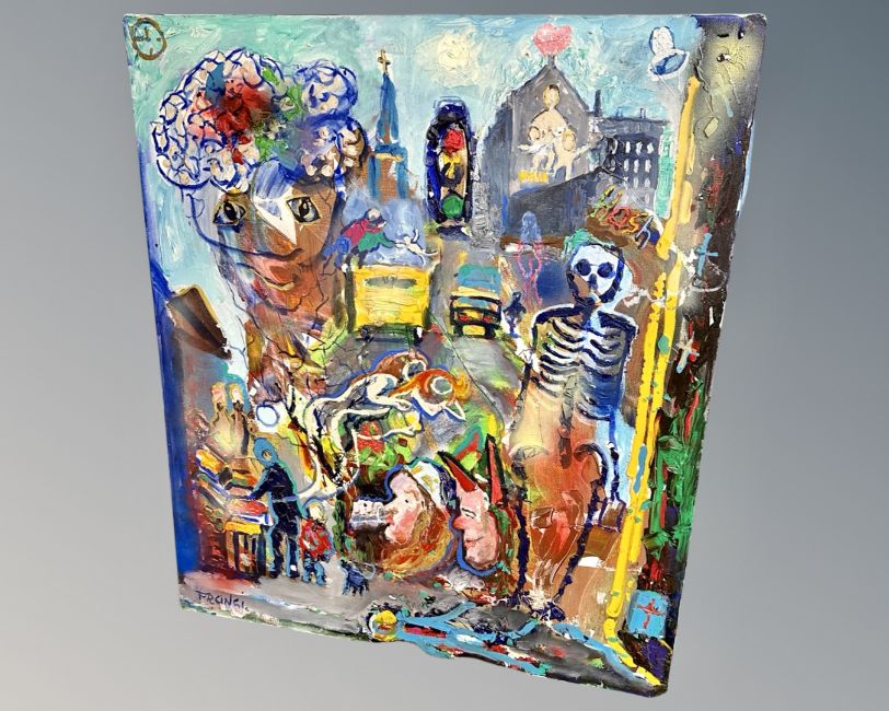 Continental school : Figures in a town, oil on canvas, 60cm by 70cm.