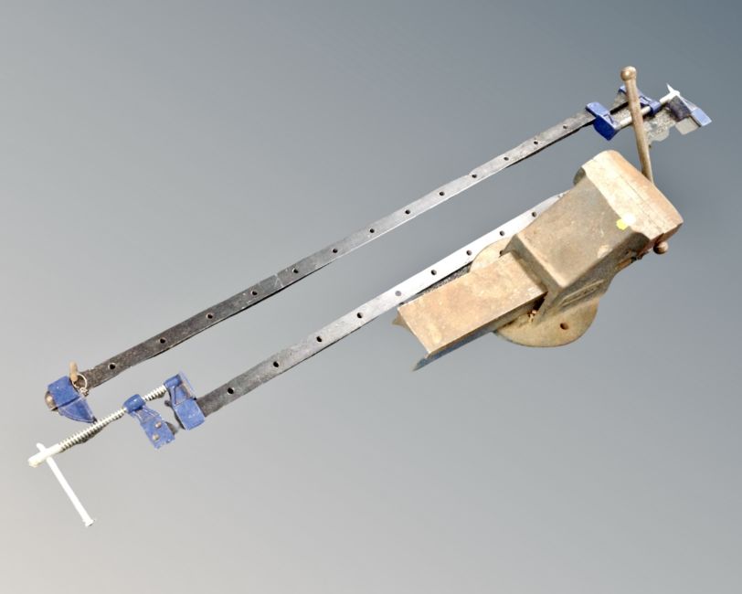 A Paramo no. 6 bench vice, together with two sash clamps.