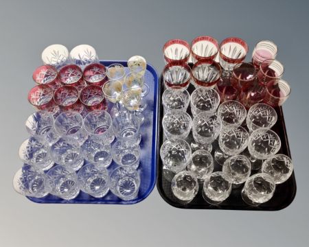 Two trays containing assorted drinking vessels including two tone wine and liqueur glasses, whiskey tumblers etc.