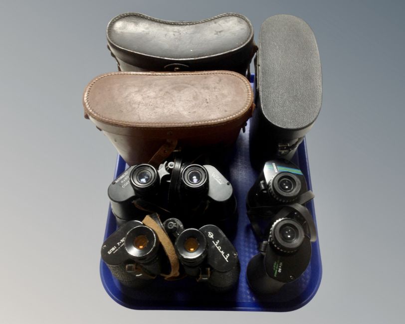 A tray containing three pairs of field glasses including Russian 7x50, Wray of London 11x60 and Chinon 10x50, all cased.