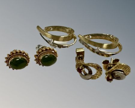Three pairs of 9ct gold earrings, examples in two-tone gold, pair set with rubies etc, gross 7g. (6)
