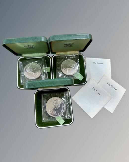 The Royal Mint : Three Elizabeth and Philip 1947-1972 Sterling silver Crowns, each 28.3g. (84.9g), all boxed.