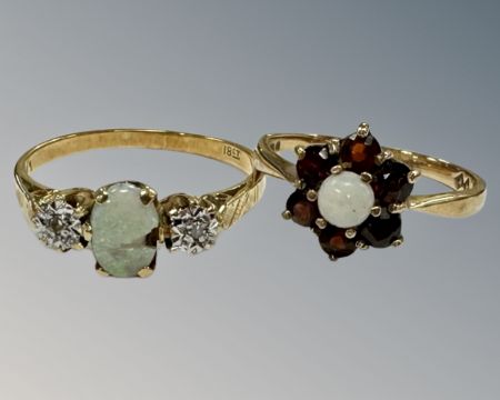 A 9ct yellow gold opal and garnet cluster ring, L, 1.6g, together with an 18ct gold opal and two stone diamond ring (af), P, 2.6g. (2)
