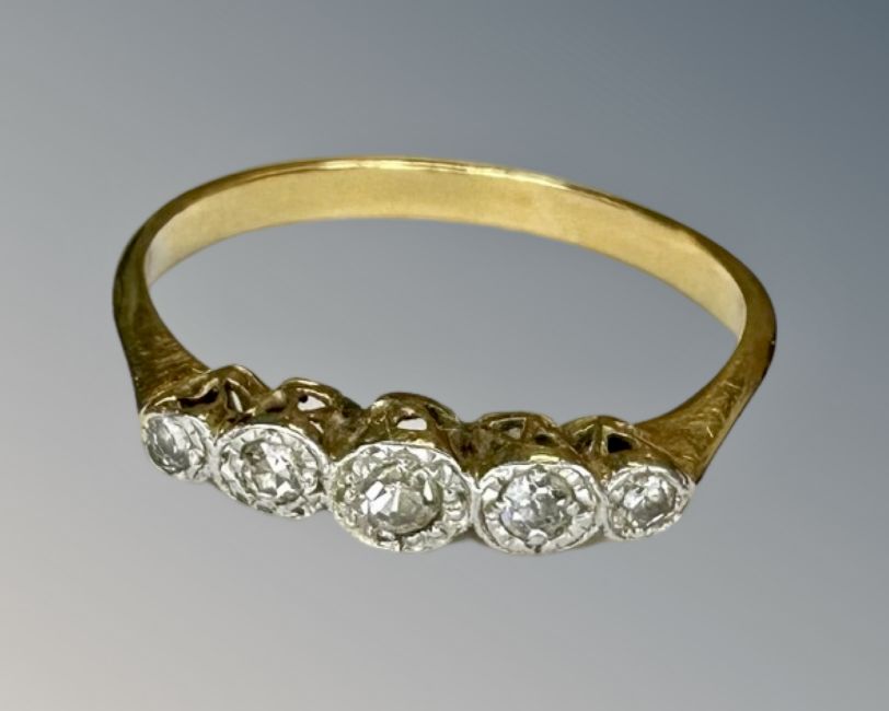 An 18ct gold five stone diamond ring, size O, 2g.