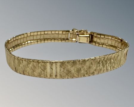 A 9ct yellow textured gold bracelet, length 18.5 cm, width 8 mm, 9.3g.