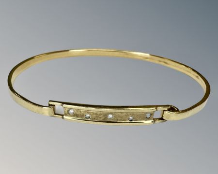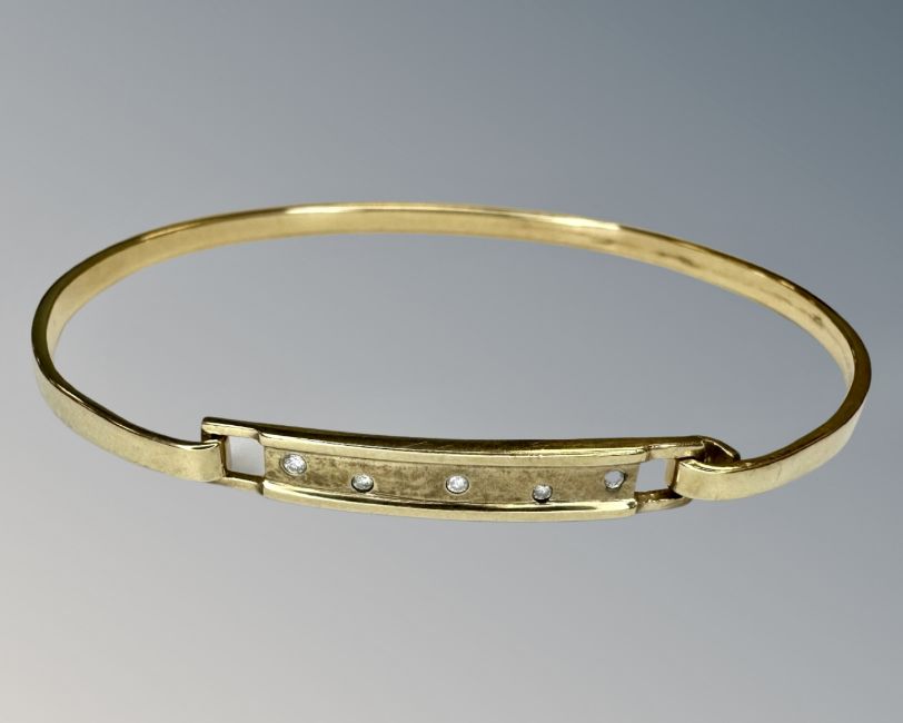 A yellow gold bangle set with diamonds, approx 6cm diameter, 9.6g.