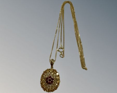 A 9ct yellow gold pendant set with coloured stones mounted on chain, 3.1g, length 45 cm.