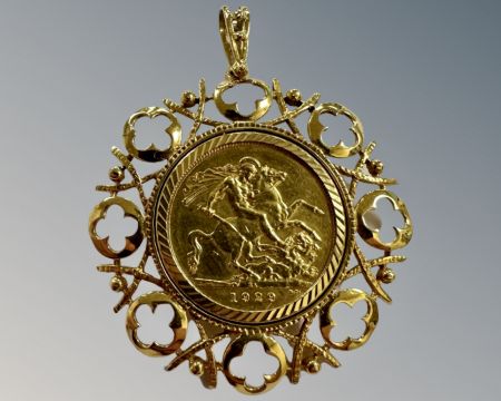 A George V gold full sovereign 1929, mounted in 9ct yellow gold pendant frame, 14.5g.