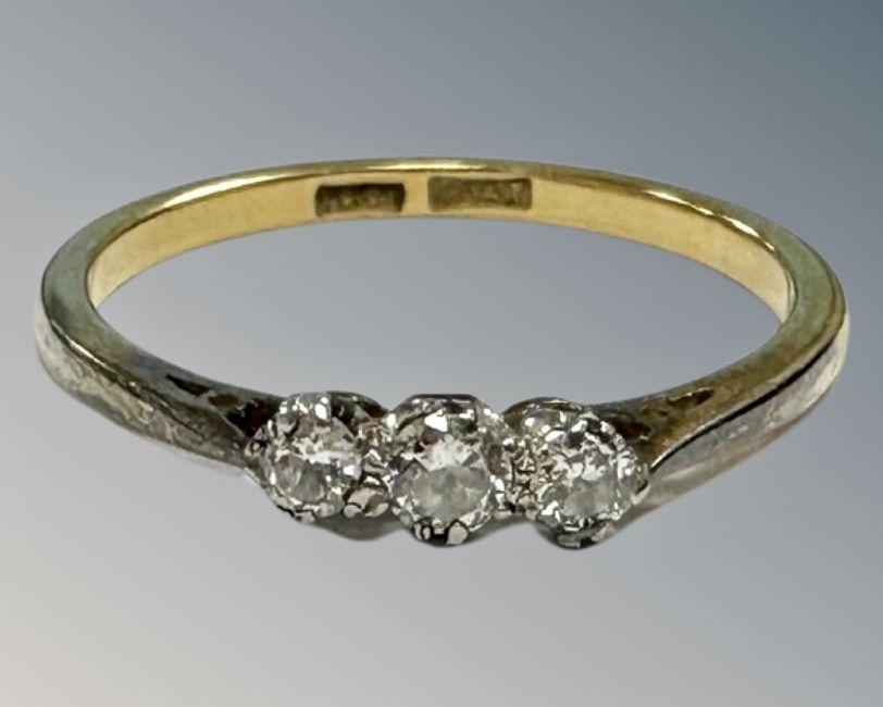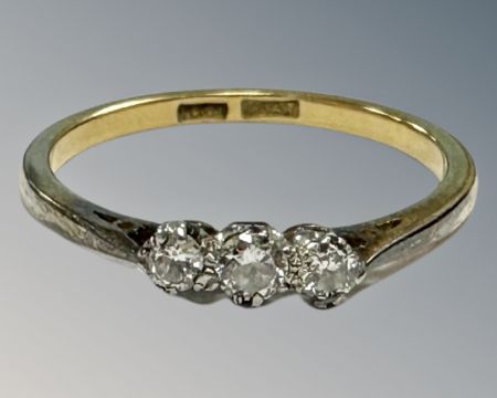 An early 20th century 18ct yellow gold and platinum set three stone diamond ring, P, 2.3g, approximately 0.2ct.