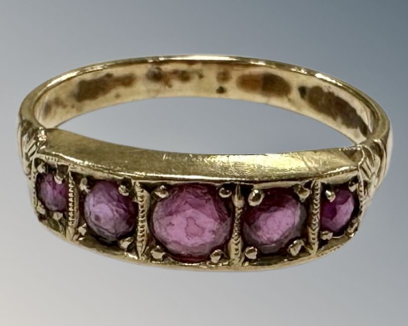 A 9ct gold five stone ruby ring, R 1/2, 3.1g.