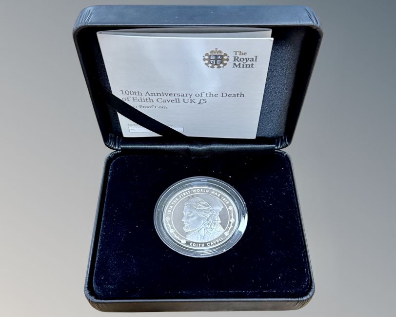 The Royal Mint : The 100th Anniversary of the death of Edith Cavell UK silver proof £5 coin, 28.28g.