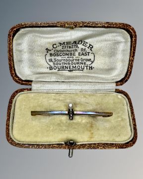 An antique gold bar brooch set with a pearl, width 4.5 cm.
