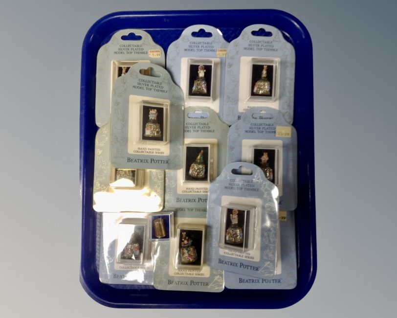 Eleven Beatrix Potter silver plated model top thimbles, original packaging, together with a further Beatrix Potter thimble in case