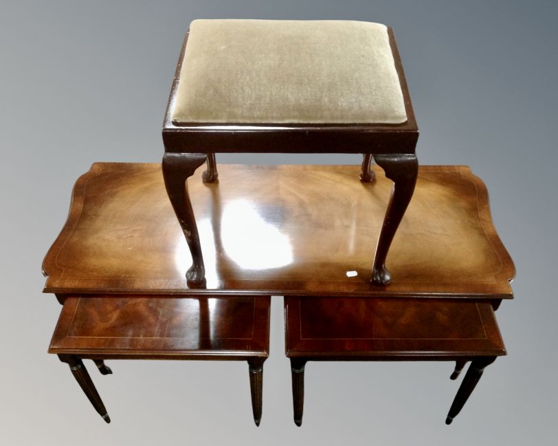 A nest of three Regency style tables together with a painted dressing table stool on Queen Anne legs.