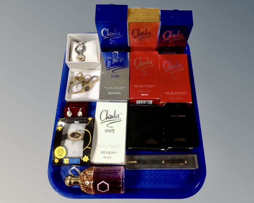 A tray of costume jewellery, wristwatches, Revlon Charlie perfumes (as found)