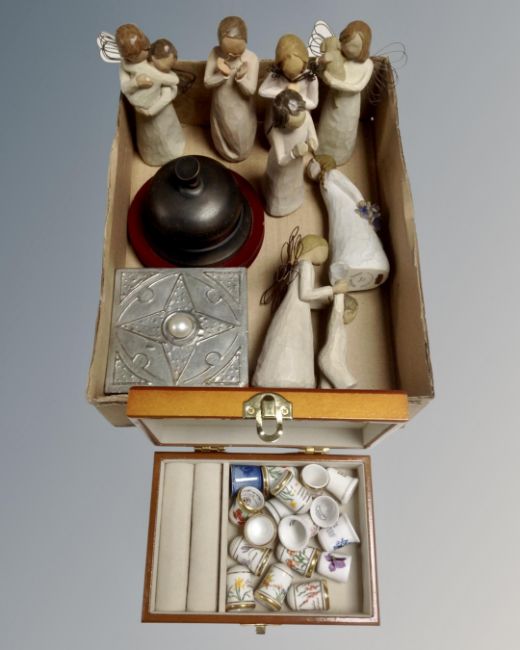 A box containing desk bell, wooden box of china thimbles, wooden ornaments etc.