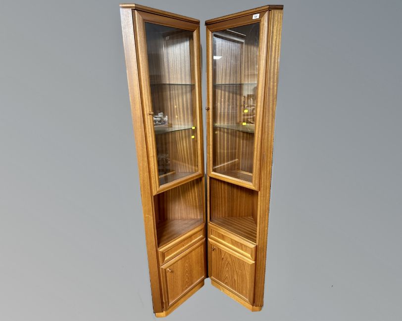 A pair of McIntosh furniture teak glazed door corner cabinets fitted with cupboards beneath.
